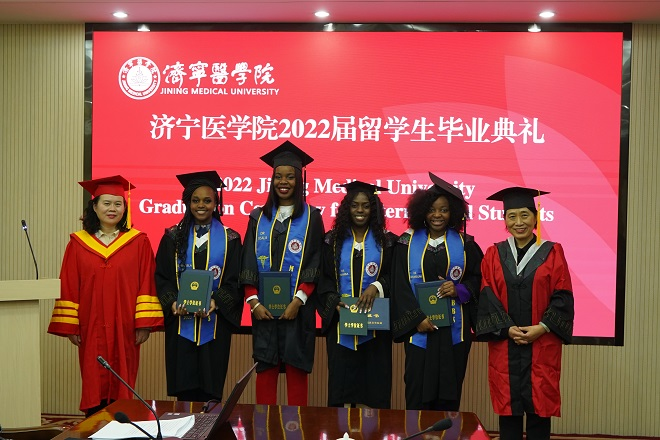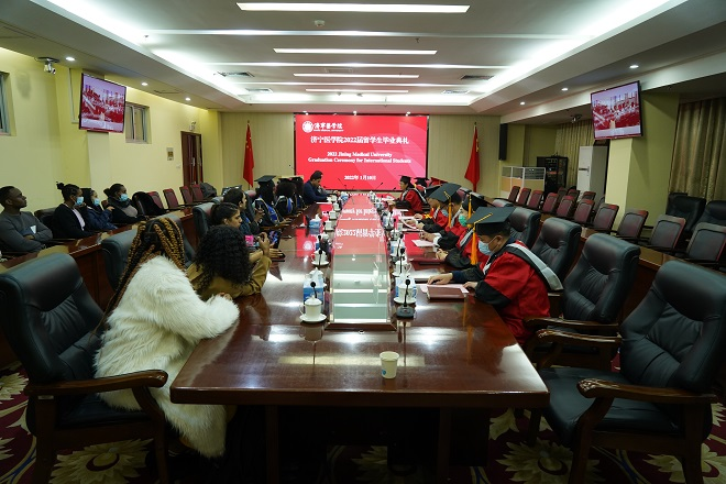On January 10th, the 2022 graduation ceremony for international students was held simultaneously on the Taibai Lake Campus, Rizhao Campus, and the countries where the international students reside. Zhao Min, a member of the Party Committee and Vice President, Ban Bo, Vice Chairman of the Jining Municipal Committee of the Chinese People's Political Consultative Conference and Vice President of the Affiliated Hospital, attended the ceremony, and Zhu Lifang, Vice President of the International Education College, presided over the ceremony.