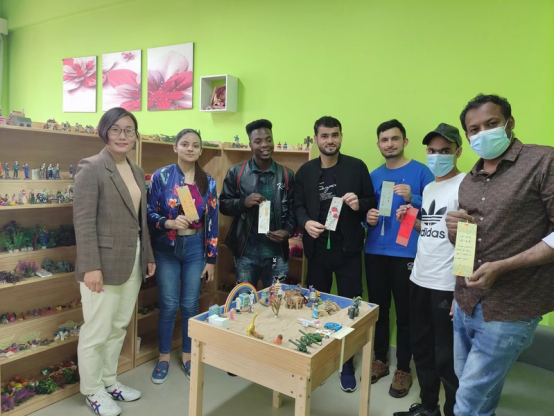 On May 11th and May 26th, the International Education College organized international students to participate in mental health education activities at the Rizhao and Jining campuses, respectively. During the event, international students, led by teachers from the Mental Health Education Guidance Center, conducted a group sandbox experience activity, visited stress relief and relaxation training rooms, group salons, and experienced VR reality in the VR psychological training room. In the activity communication section, students ask questions to the center's guidance teacher, who patiently guides them to gradually open their hearts, share and confide in each other, communicate with each other, and express their feelings.